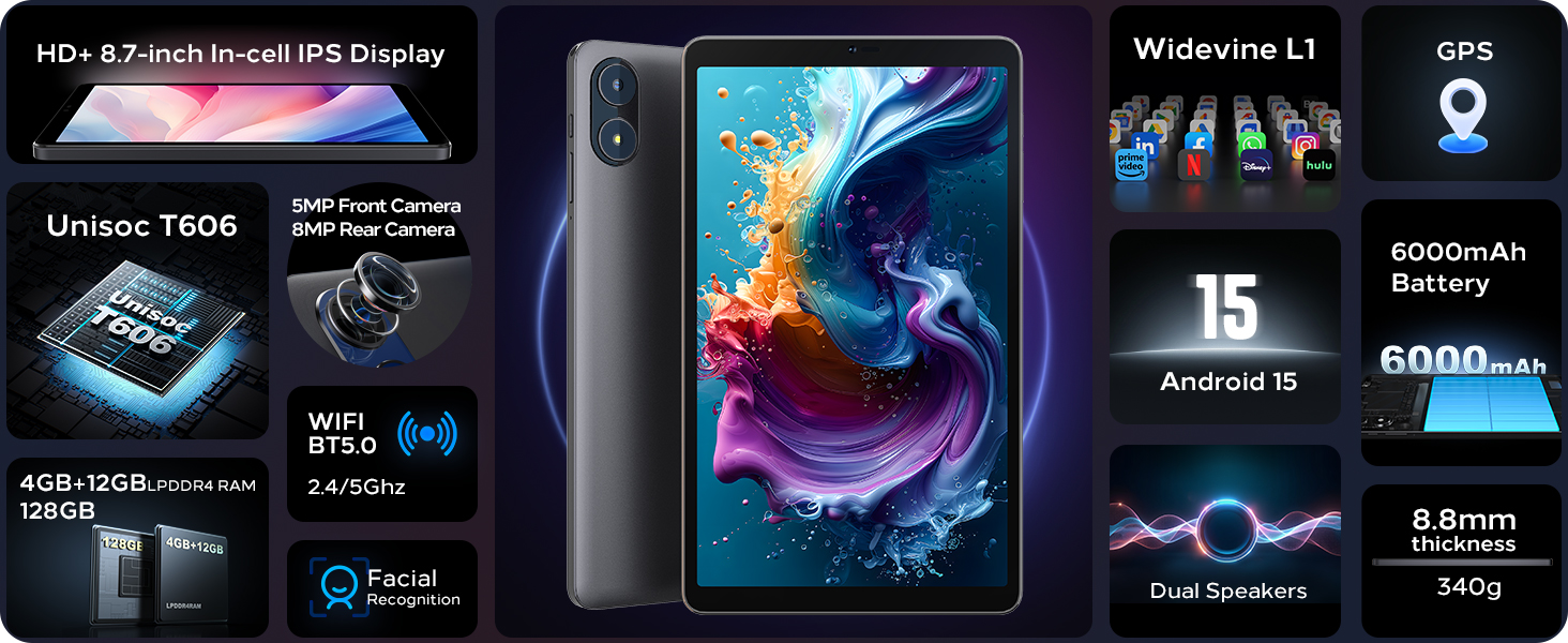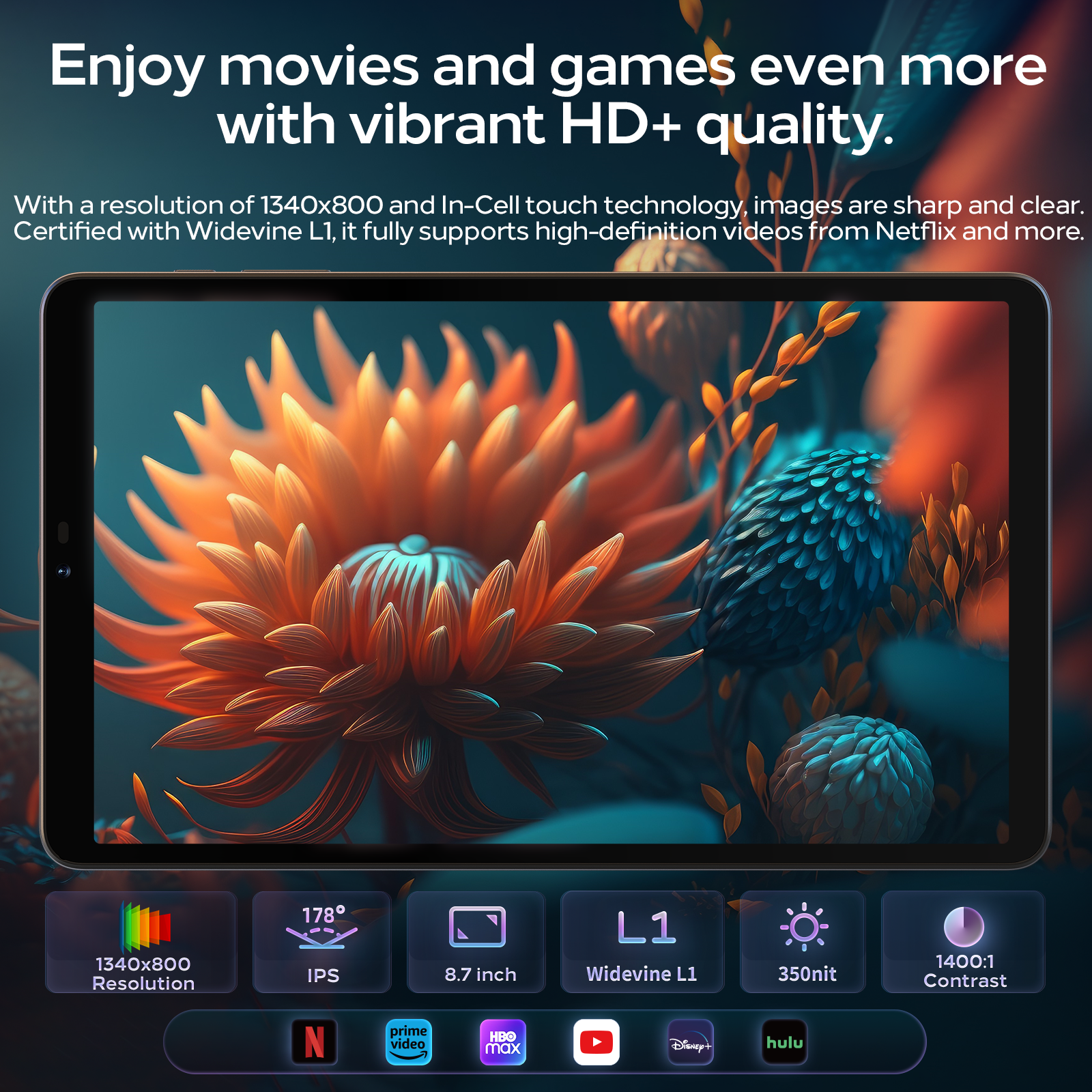 【8.7″ HD IPS Display with Widevine L1】Equipped with an 8.7-inch HD IPS screen (1340×800) and Widevine L1 certification—delivering vibrant visuals and true HD streaming on Netflix, Prime Video, and Disney+.
