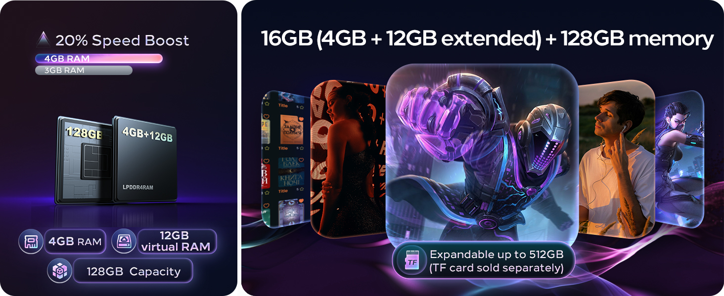 【4GB RAM + 12GB Virtual Expansion, 128GB Storage】Features 4GB physical RAM with 12GB virtual memory expansion and 128GB internal storage—enabling smooth multitasking and ample space for apps, photos, and media.