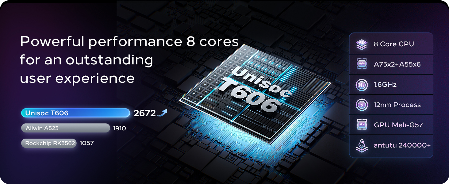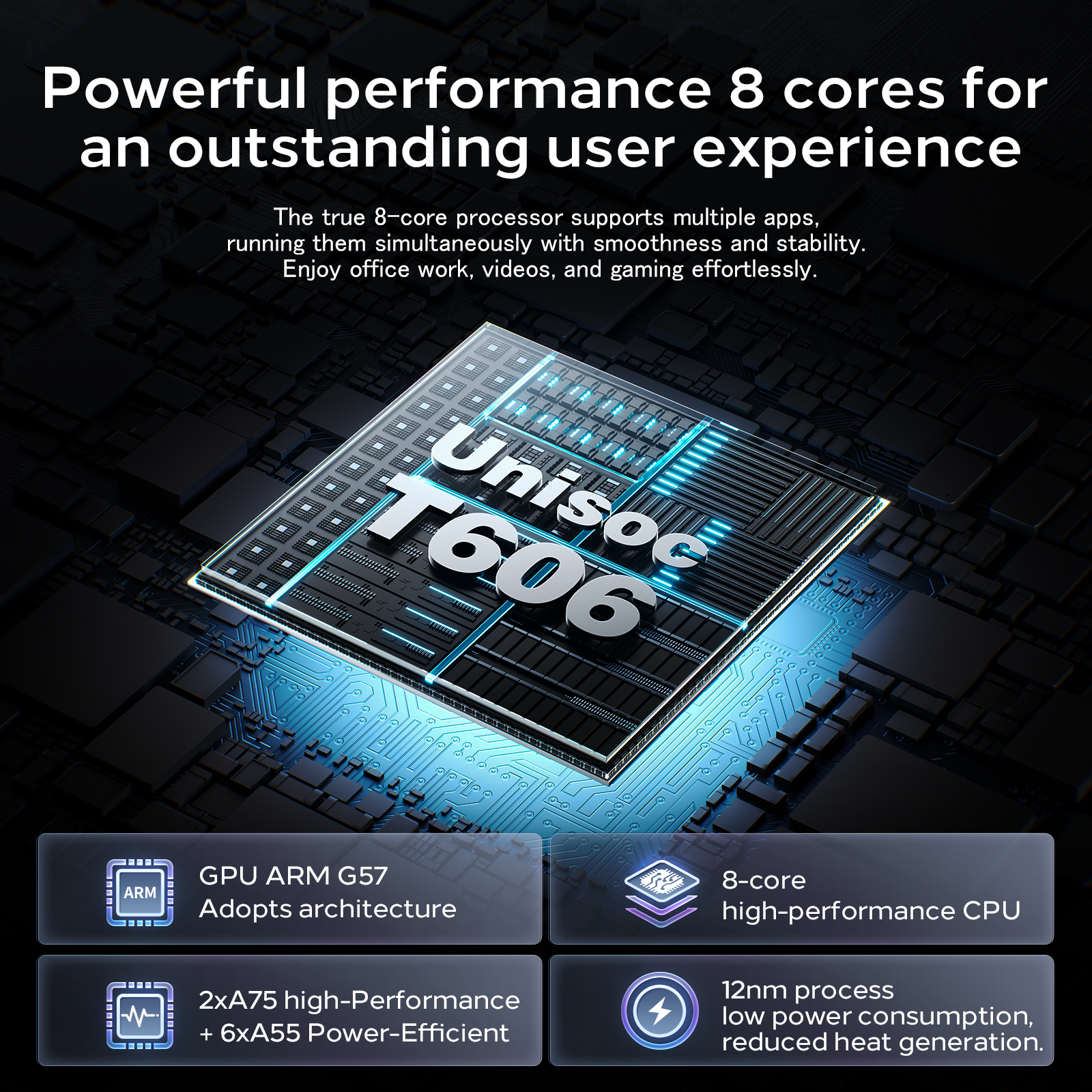 【Ultra-Efficient Unisoc T606 Octa-Core Processor】Powered by a 12nm Unisoc T606 chipset with dual Cortex-A75 + hexa Cortex-A55 cores (1.6GHz) and Mali-G57 MP1 GPU—optimized for streaming, light gaming, and multitasking with low power consumption.