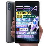 E8A Android 15 Tablet 8.7 inch, Octa Core, 16GB RAM, 128GB ROM, 1TB Expandable, 8.7″ HD IPS 1340×800, 5MP+8MP Camera, 5G WiFi+BT5.0+GPS, Type-C, with Headphone Jack, Leather Case Included